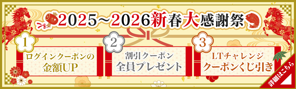 2026年【新春大感謝祭を開催!】第1弾 ログインクーポンの金額UP!2025年12月26日〜2026年1月3日はログインクーポンの金額を、1,000円2,000円3,000円にアップします!!第2